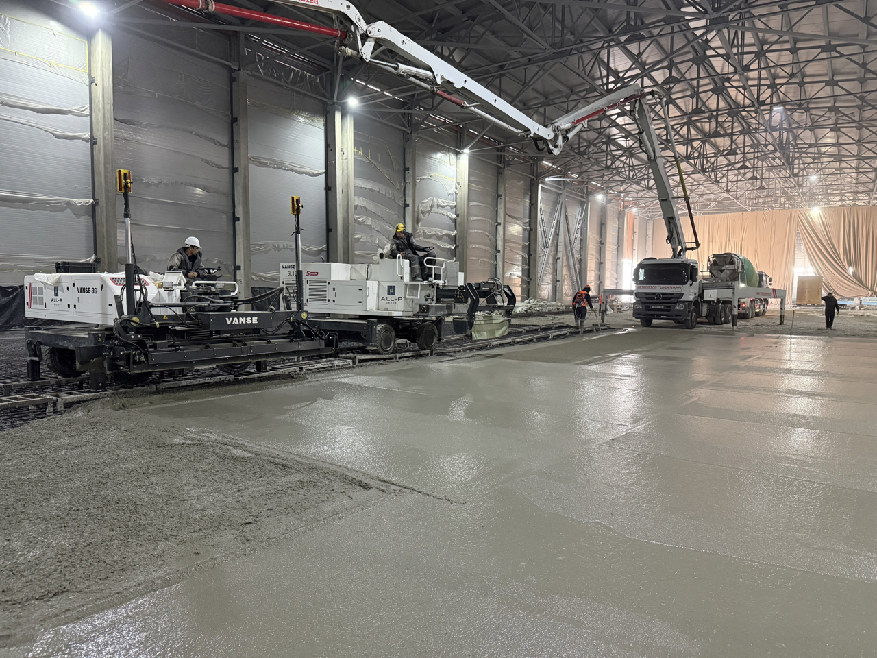 The completed flooring system provides a highly durable, level, and low-maintenance surface, capable of withstanding heavy mechanical loads and ensuring safe and efficient operations.