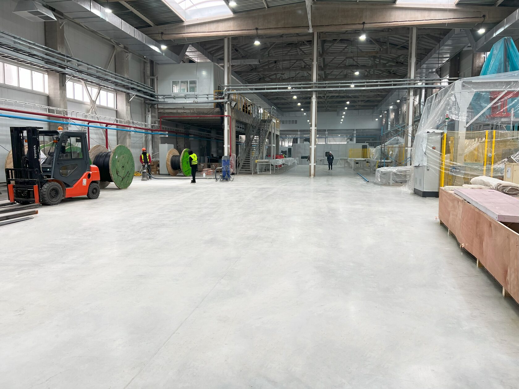 Qalinligi 200 mm bo‘lgan beton plitasi M400 (B30) markasidan, Dramix 4D turdagi metal fibra qo‘llangan holda quyildi. Bu yechim betonning egiluvchanlikka nisbatan yuqori mustahkamligini va uning uch o‘lchovli bir tekis armirlanishini ta’minladi hamda ishlar muddatini sezilarli darajada qisqartirdi.